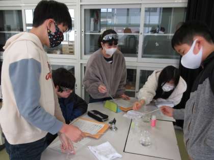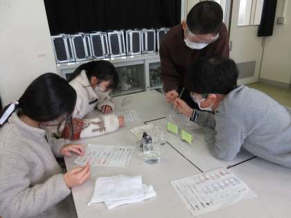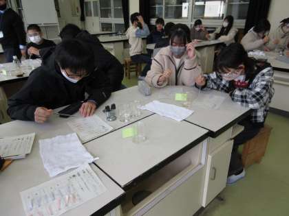 石灰水、アンモニア水、塩酸等、いくつもの水溶液を順番に調べました。リトマス紙の色の変化で、アルカリ性・酸性・中性が分かるので、興味をもって実験することができました。