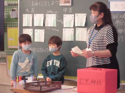 「おみくじの大吉の秘密を考えよう」という課題で、分数の学習の導入を行いました。おりがみを折り曲げたり、切ったりしながら二分の一の大きさについて体感しながら学ぶことができました。
