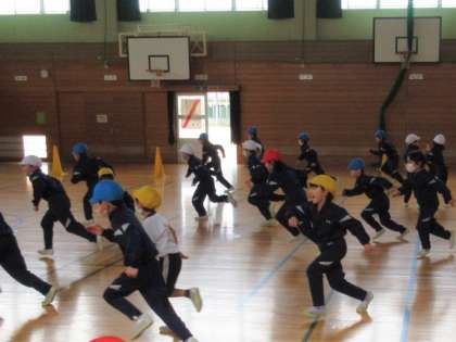 「ねこ」役と「ねずみ」役を決め、先生が「ねこ」と叫ぶと、「ねこ」が「ねずみ」を追いかけ、「ねずみ」と叫ぶと、「ねずみ」が「ねこ」を追いかけるゲームをしました。楽しみながら、ダッシュの運動です。
