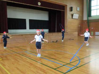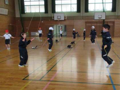 後半は、縄跳び運動をしました。自分の好きな技に挑戦したり、前回し跳びでひっかかるまで跳び続ける競争をしたりしました。また、みんなで二重跳びにも挑戦し、終始元気よく運動しました。