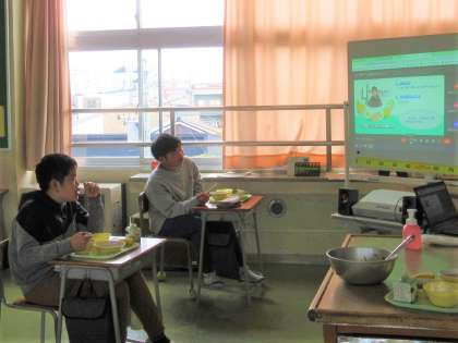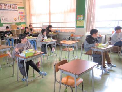 6年生の子供たちは、食事をしながら嬉しそうに放送を楽しみました。