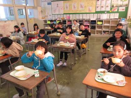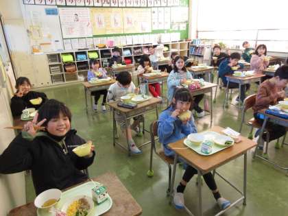 写真は、3年生教室の様子です。「おいしい」と言って、満足そうな顔で給食を味わいました。