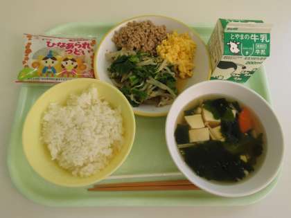 菜花ひたし、すまし汁、ご飯、牛乳、ひなあられ