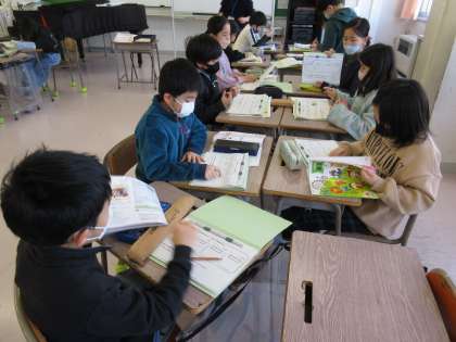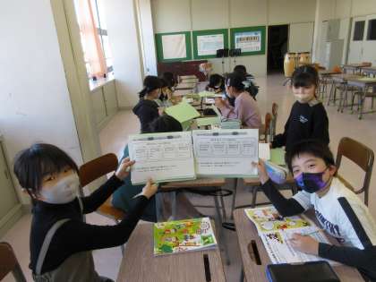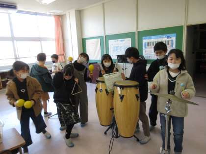 グループで、トーンチャイム、鉄琴、小太鼓、マラカス等の楽器演奏担当を確認しました。そして、話し合いながら、それらの楽器の響きの長さや音色の違いを生かして、「まほうの音楽のもと」をつくりました。