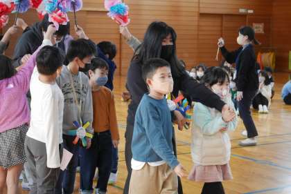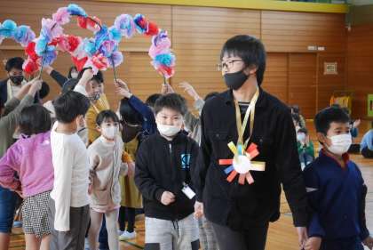 エスコートするのは1年生。1年生の手作りメダルを首からかけています。みんなとても嬉しそうです。