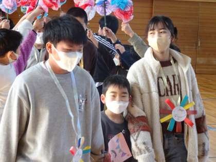6年生は、2年生の作ったきれいな花のアーチをくぐって入場しました。