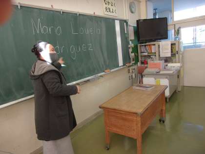 ALTのルエラ先生より、日本の食べ物や好きな色、基本的な動作の外国語での言い方を学びました。