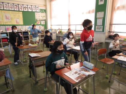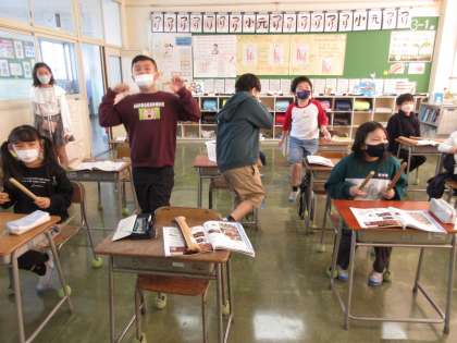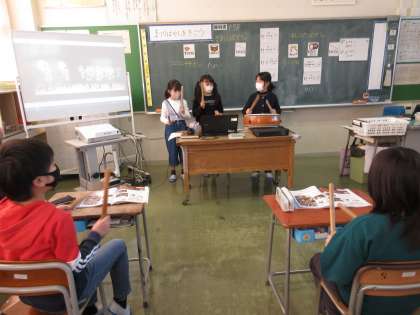 動画に合わせて、軽やかにばちで叩いてリズムを刻みました。楽しく踊る子供も出てきて、心も体も温まる授業になりました。
