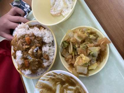 今日の給食は、カレーライスでした。6年生で最も人気のある献立です。おかわりは、お皿から溢れるほどして、カレーはもちろんご飯、野菜等もなくなり食べキリンとなった日でした。