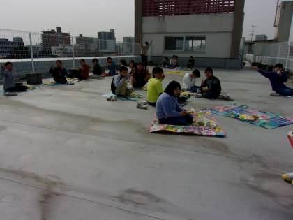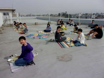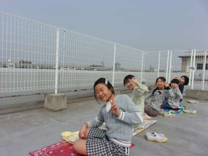 子供たちが選んだごほうびは、「屋上で給食」です。3月とは思えない暖かさの中、いつもとは違った開放感と景色を味わいながら、楽しく給食を食べました。