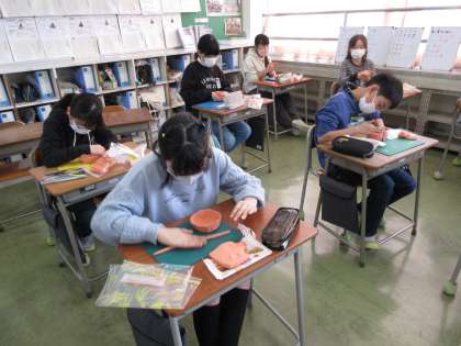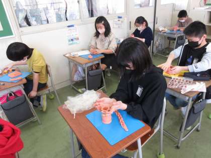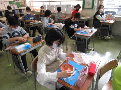 子供たちが、黙々と粘土をこねて成形しています。題材名は、「使って楽しい焼き物(風)」です。