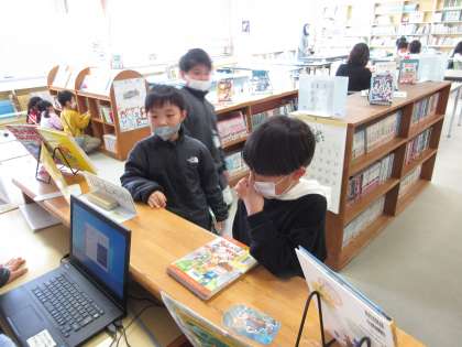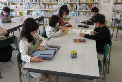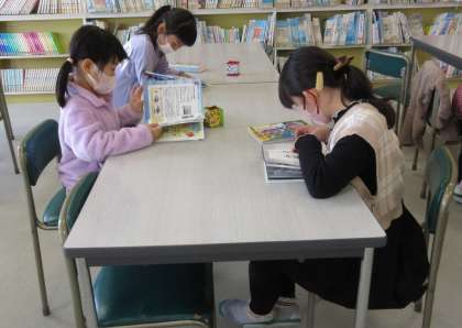 図書室で読書タイムです。1年生は、時々図書室で読書したり、学校司書の先生に読み聞かせをしてもらったりしています。