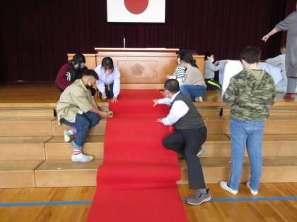 明日の卒業式予行に向けて、式場を準備するのは5年生です。1年生〜4年生、6年生が5限終了で下校し、6限目に行いました。