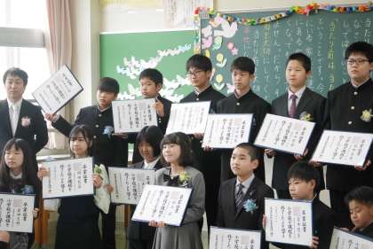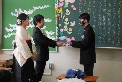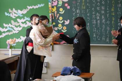 退場後に教室に戻り、全員で記念撮影をした後に、サプライズがありました。6年生の保護者全員から、担任の中田先生、長谷川先生に花束が贈られました。さらに、卒業生一人一人のメッセージが書かれた色紙もプレゼントされました。お二人の先生は、思わぬ出来事に笑顔が絶えませんでした。