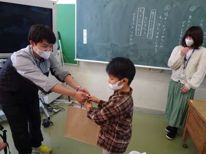 1年生の保護者の方々が、真島先生と長越先生の結婚をお祝いするために、帰りの会にサプライズで来られました。子供たちの写真が入った色紙とお祝いの品物を持参され、代表の子供が手渡しました。二人とも、突然のことに驚くとともに、とても喜んでいました。保護者の方々、お心遣いありがとうございました。最後に記念撮影をしました。
