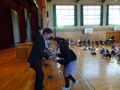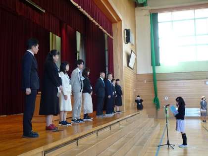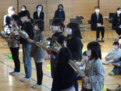 その後、児童代表がお別れの言葉を述べ、花束を渡す児童が言葉を述べた後に、花束を渡しました。退職・転任される教職員の方々は、とても喜ばれていました。