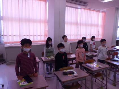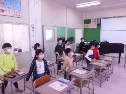 校歌を元気よく歌いました。新しく来られた音楽の先生の指導のもと、足を肩幅に広げて歌うことを意識し、練習しました。「新1年生に校歌を聞かせてあげたい」と言っている子供たちでした。