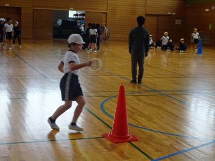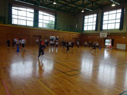 体育館で色団対抗のリレーを行いました。自分の色団の勝利のために、必死に走り、走っていない子供たちは大きな声で応援しました。