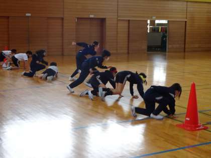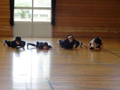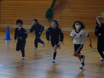 春休みで少し運動から離れていたことも考慮して、いろいろな形のダッシュをしました。ジャンプしてから、うつぶせの状態から、仰向けの状態からなど行い、子供たちは、楽しく走りました。
