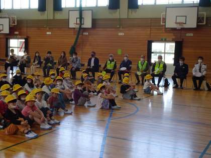 富山中央警察署交通課係長さん、東交番所長さん、交通安全協会や自治振興会防火防犯部長、PTAの方々に来校いただき、1・2年生の交通安全教室を行いました。