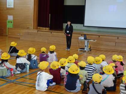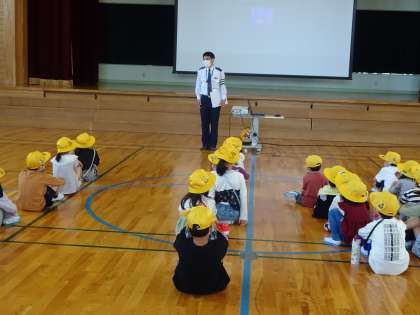 校長先生のお話を聞いた後に、交通課係長さんから、交通安全の話をしていただきました。安全のためには、「止まる」「見る」「待つ」ことが大事であると学びました。