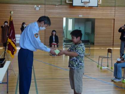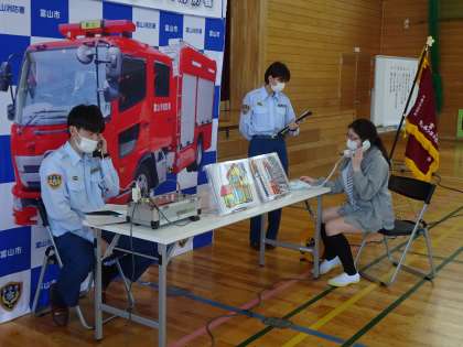 授与式の後は、防火教室を行い、119番通報の仕方を実際に電話対応しながら教えていただきました。代表の児童は、火災の状況を上手に説明できました。