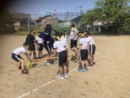 運動会で、3・4年生が行う団体競技、台風の目の練習を行いました。3年生は、4年生のアドバイスを受けて練習しました。4年生は昨年の経験を活かして、中心となって作戦を立てました。