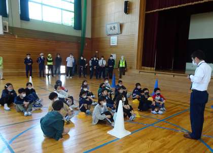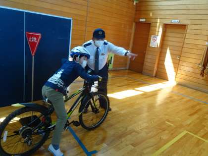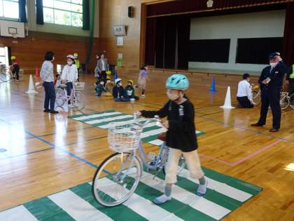 前半は4年生が乗る前の点検の仕方を学び、その後、実際に自転車に乗って交通安全について学びました。出発時、停止時には、「右後方の安全を確認」することを繰り返し教えていただきました。
