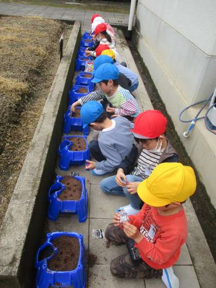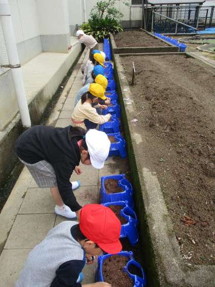 担任に連休中にあったことをたくさん話をしてくれた1年生。雨が止んだ時に、あさがおの種をまきました。これから世話をしながら観察していきます。