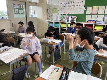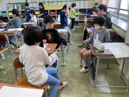 かけ算九九を見直して、かけ算の決まりを使ってじゃんけんゲームをしました。ぱーで勝つと3点、ちょきで勝つと2点、ぐーで勝つと1点、負けると0点です。ペアでじゃんけんをして記録しながら合計点を競いました。
