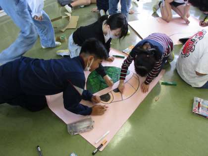 応援合戦に使うグッズの準備を進めました。学校にあった材料を生かして、友達と相談しながらアイディアを出し合い、次々に作っていました。どの団も、とても熱が入っています。
