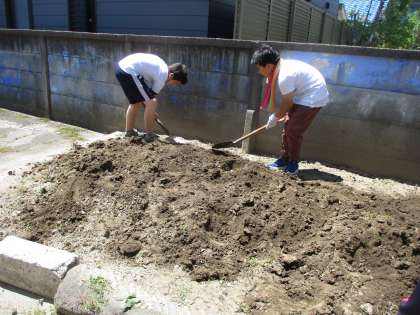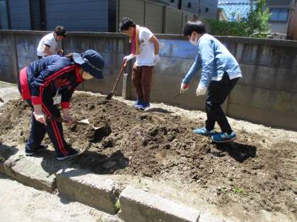 野菜の苗を植えるために、畑を耕しました。しばらくそのままになっていた土は固くなっていましたが、みんなで協力して掘り起こし、ふかふかの畝が二つできました。