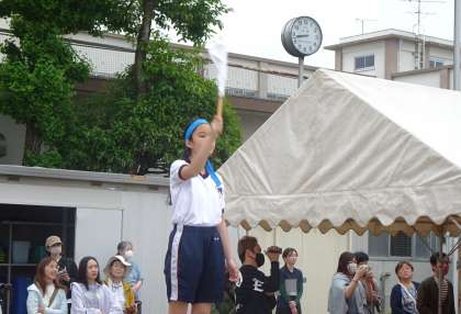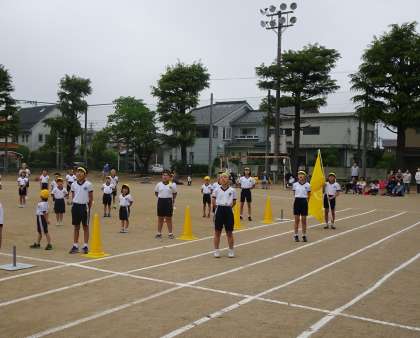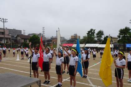 涼しい曇り空の中、開会式を行いました。各団の団長が力強く決意表明を述べ、運動会の歌「ゴーゴーゴー」を、曇り空を吹き飛ばすような元気声で歌いました。