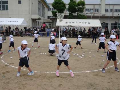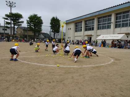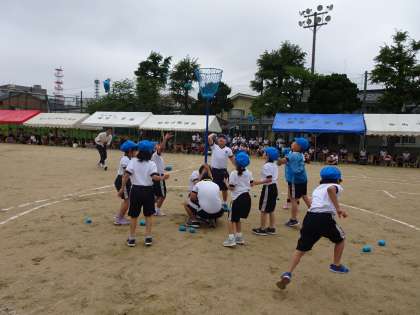 1・2年生が玉入れを行いました。音楽に合わせてダンスを踊り、ダンスが終わると、素早く玉を拾い、籠にめがけて一生懸命投げました。