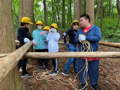 作る場所を決め、丸太を運んで木と結びます。みんなで協力して楽しく取り組んでいます。午前の部は終わり、昼食後に続きをします。