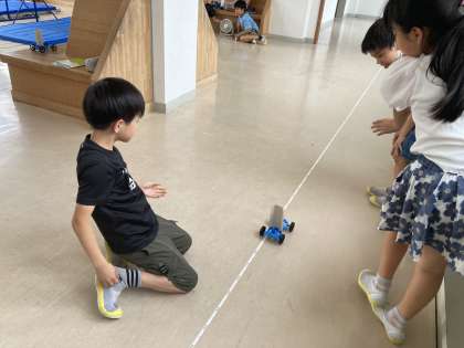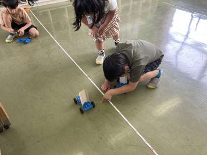 風の力を使って車の動く距離を計測しました。弱い風の力と強い風の力を送り、それぞれどのくらい動くか比較していきます。