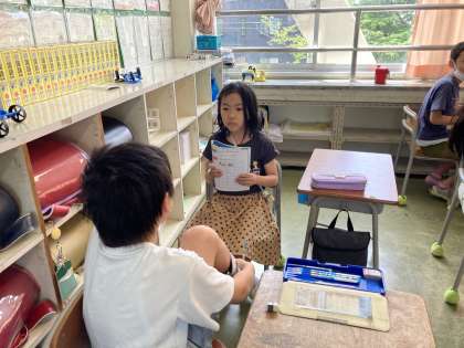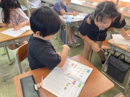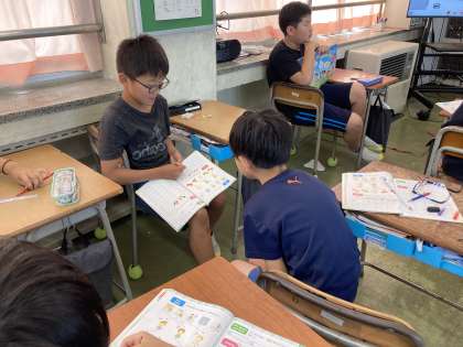 「What sports do you like?」「I like soccer.」「What food do you like?」「I like apple.」など友達の好きな物を尋ねたり、聞いたりしました。発音や答え方がとても上手になりました。