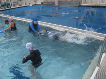 3、4年生でプール学習を行っています。2つのグループに分かれて、けのびを意識して泳いだり、ペアになって泳いだりしました。