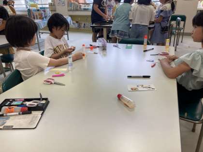 図書委員会の企画でしおり作りを行いました。図書室に置いてある本に登場するキャラクターやイメージできるものを貼り付けて完成させていきました。