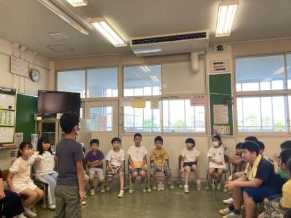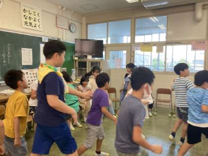 フルーツバスケットをして夏休みの振り返りを行いました。「夏休みにトロッコ電車に乗った人」「夏休みに旅行に行った人」など楽しかった思い出を振り返り友達と共有しました。