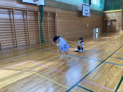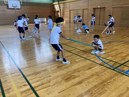 新聞紙と棒やフラフープを使って体つくり運動を行いました。新聞紙に乗る人は、バランスを崩さないように乗ります。引っ張る人は、力を入れすぎないように引っ張ります。お互いにバランス感覚を養いながら活動しました。