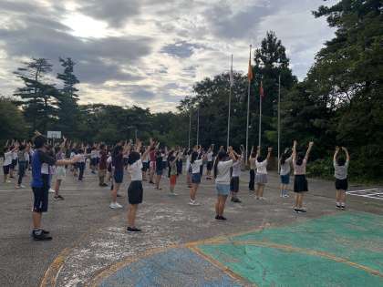 6時に起床後、清掃をしました。その後、フレッシュタイムで他の団体と集まり、交流しました。