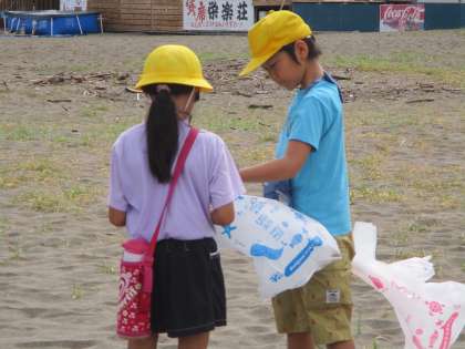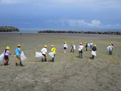 次は、岩瀬浜に行ってごみ拾いをしました。ペアになって、一生懸命にごみを拾いました。子供たちの予想通り、プラスチックの破片やペットボトルのごみが多く見つかりました。