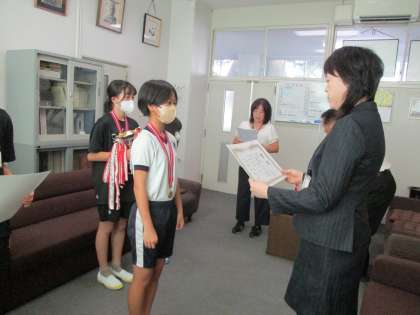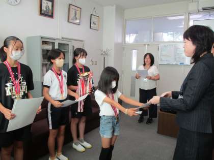 奥田ミニバスケットボール教室の子供たちが、大会で活躍し優秀な成績を収めました。校長室で受賞式を行いました。
