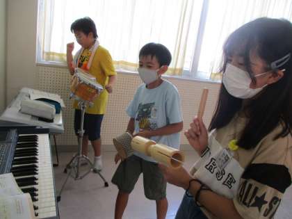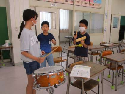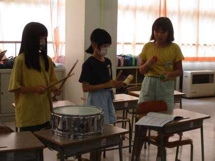 音楽の学習では、3人組になってリズムアンサンブルをしています。楽器の材質や音の特徴から使用する楽器を自分たちで決めました。リズムをつなげたり重ねたりして、イメージを膨らませています。