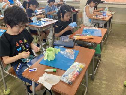 ペットボトルと紙粘土を使ってペン立てを作りました。紙粘土には、絵の具を使い色をつけたり、形を作ったりしてオリジナルのペン立てを製作できました。