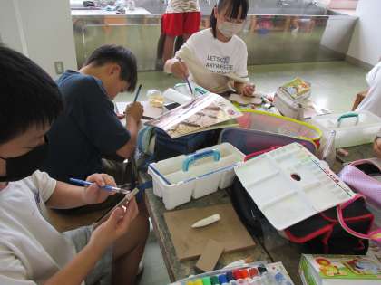 電動糸のこぎりを使ってテープカッターを作っています。今日は、下書きが終わった子から板を切ってみました。最初は緊張していましたが、板をゆっくり慎重に動かし、上手に切ることができました。順番を待っている時は、色塗りを進めました。