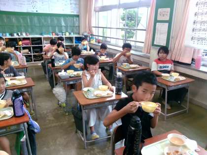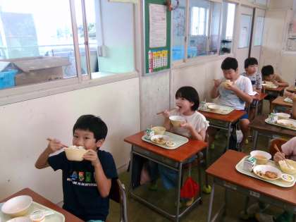 今日の給食を食べる様子です。おかわりは完売してたくさん食べています。