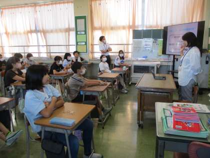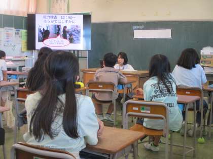 10月5日(木)に行われる就学時健康診断では、5年生が中心となって、来年度入学予定の子供たちのお世話をします。今日は、養護教諭の松村先生から、仕事の役割や内容について、スライドを使って説明がありました。