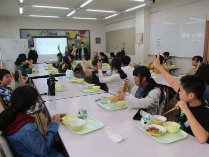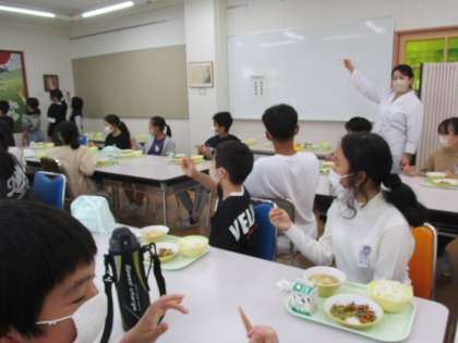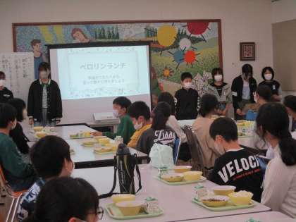 給食委員会のみんなが企画してくれたランチルーム会食がありました。4年ぶりのランチルーム会食にとても嬉しそうで、笑顔が見られました。食器の置き方や箸の使い方のマナー講座や、給食クイズなどがあり、楽しく会食することができました。